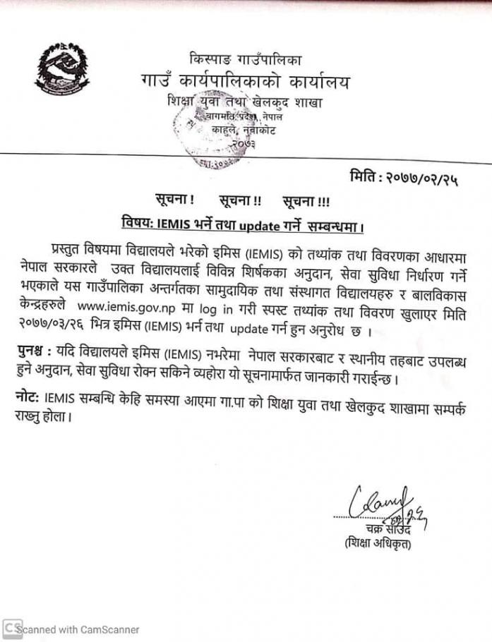 सम्पूर्ण विद्यालयहरुलाई IEMIS भर्ने तथा Update गर्ने सम्बन्धि सुचना