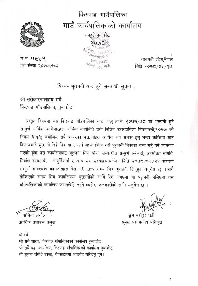 भुक्तानी बन्द हुने सम्बन्धि सूचना