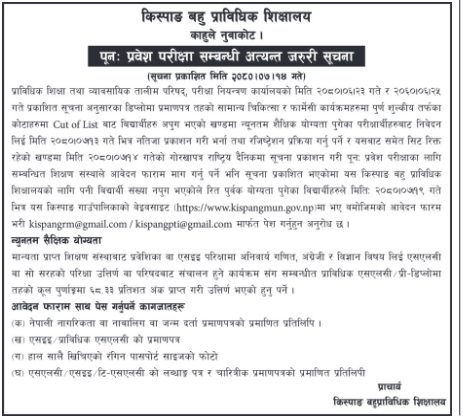 पुन:प्रवेश परीक्षा सम्बन्धि अत्यन्त जरूरी सूचना