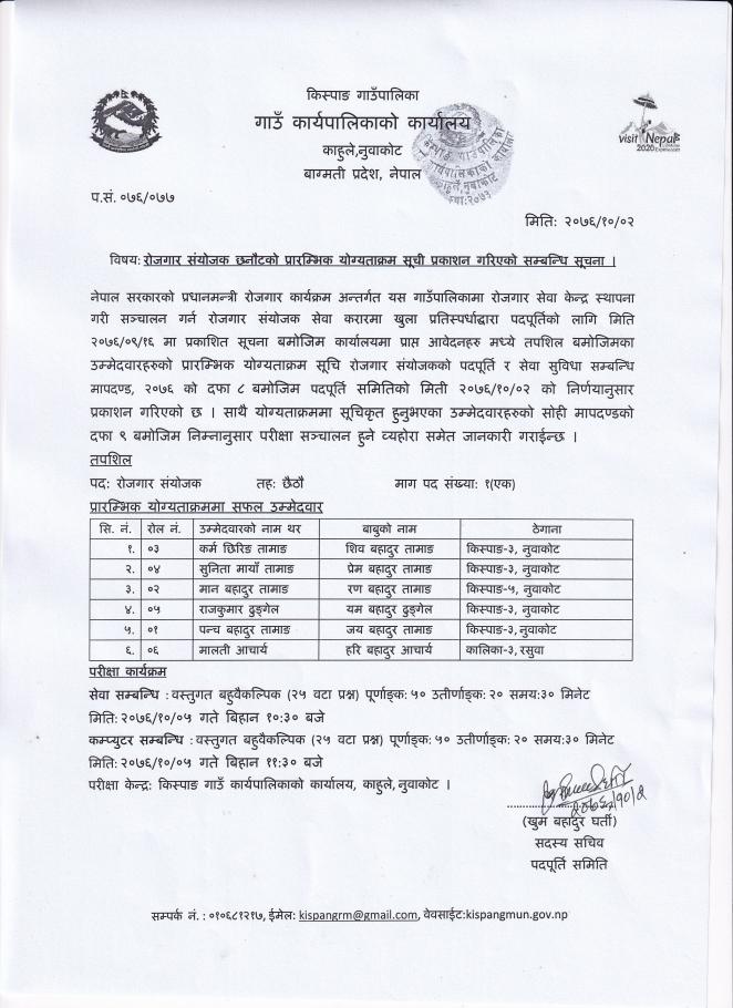 रोजगार संयोजक छनौटको प्रारम्भिक योग्यताक्रम सूची प्रकाशन तथा लिखित परीक्षा सम्बन्धि सूचना